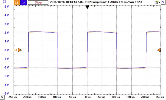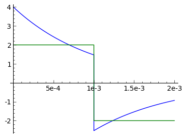 最初の波形は、まさにSageで計算したものに一致します。 徐々に、2Vと-2Vでの変化に変わっています。 最初の波形は、コンデンサーの初期電荷が0を仮定していますが、周波数が大きいため、完全に放電するまえに 次の充電が行われているため異なる値となったと思われます。(要確認です!)