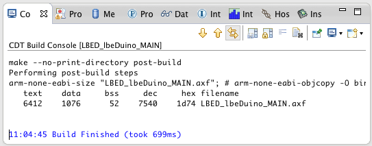 ビルドは、LBED_lbeDuino_MAINプロジェクトを右クリックして、Clean Projectを実行した後、Build Projectを選択します。