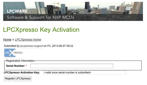 アクティベートには、以下のページでregisterからユーザ登録して、loginしてください。 LPCXpresso Key Activation