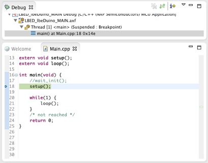 初回だけデバッグ用の設定を作成するために、Quickstart PanelからDebug 'LBED_lbeDuino_MAIN'[Debug]を選択します。 2回目以降は、メニューアイコンの虫をクリックするだけです。