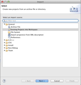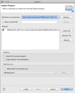 Select root directoryのBrowse...ボタンでgitコマンドでダウンロードしたlbedの必要なプロジェクトのディレクトリを 選択し、Finishiボタンを押します。