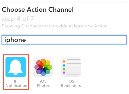 Choose Action Channelが表示されるので、iPhoneと入力し、iPhoneのIF Notificationを選択します。