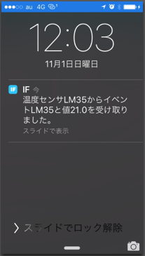 温度センサLM35からイベント{{EventName}}と値{{Value1}}を受け取りました。