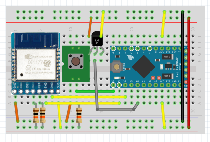 ブレッドボードにESP-WROOM-02とArduino Pro Mini(3.3V)とLM35を以下の様に配置します。 抵抗は10KΩを使いました。