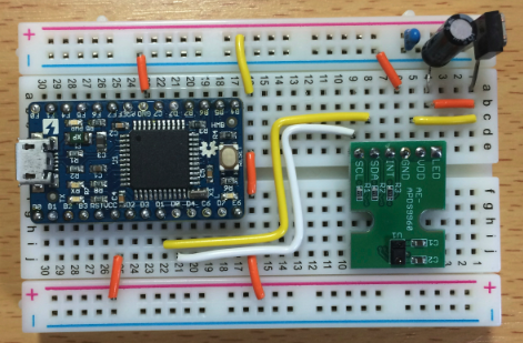 APDS9960は3.3Vを使用するので、Arduino勉強会でも紹介した 作って遊べるArduino互換機 の3.3Vを使って動かしてみます。