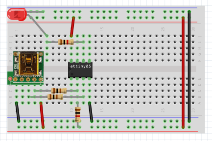 8pinoの回路を参考に最初にブレッドボードでATtiny85を使ったGemmaを組み立てます。 USBとの接続部分は100Ωの抵抗、プルアップとLEDには1KΩの抵抗を使いました。