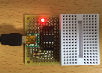 ATtiny85をlbedGemma用のブレッドボードに戻し、USBケーブルを接続すると LEDが細かく点滅したら、ブートローダの書き込みが正常に行われています。