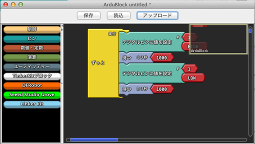 ツール→ArduBlockを選択し、以下のスケッチを作成します。