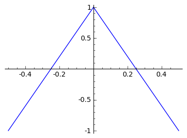 Sageで三角波を表現する場合には、区分関数(Piecewse)を使用します。 三角波では、区間を-0.5から0と0から0.5の2つに分け、それぞれf1, f2で関数を定義します。