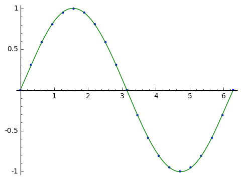 b(x) = model.subs(fit) list_plot(a, figsize=5)+plot(b(x), [x, 0, 2*pi], rgbcolor='green', figsize=5)