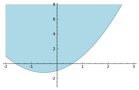g(x, y) = y > x^2 + x - 1 region_plot(g(x, y), [x, -2, 3], [y, -3, 8], incol='lightblue', bordercol='gray')