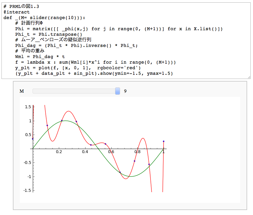 図2 Sin曲線のフィッティング問題で多項式の次数Mをスライダーバーで与えた例