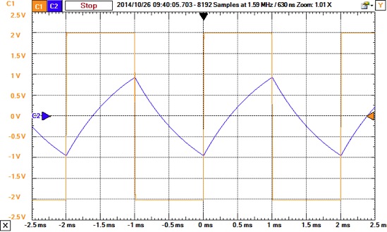 500Hzでは、方形波の変化が時定数の1msとなっており、方形波を積分したときの三角波に近い形を示しています。 *6