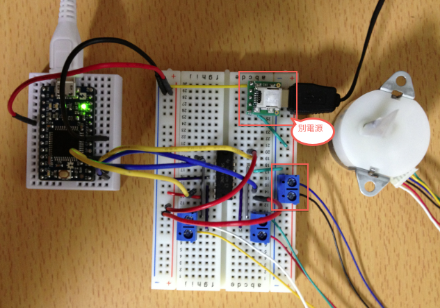 ここで、注意するのは、モータの黒と青の線は、モータ用の電源Vccに接続することです。