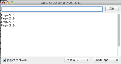 できたスケッチをブレッドボードに書き込み、USBケーブルをUSBシリアルに付け替えて、 シリアルモニターを開くと、温度が表示されます。