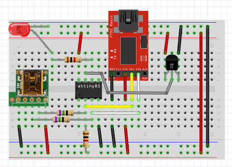 8pinoの回路を参考に最初にブレッドボードでATtiny85を使ったGemmaを組み立てます。 USBとの接続部分は75Ωの抵抗、プルアップとLEDには1KΩの抵抗を使いました。