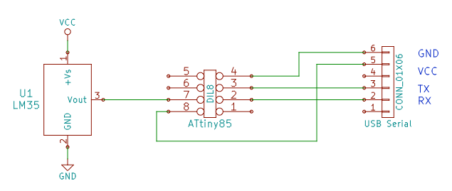 シリアル通信の回路に温度センサーLM35を追加した回路は、以下の様になります。