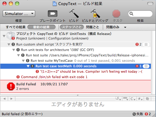 単体テストに失敗すると「CopyTest-ビルド結果」のウィンドウにエラーが表示されるのですが、 正常終了の場合は、Build Succeededとしか出力されません。