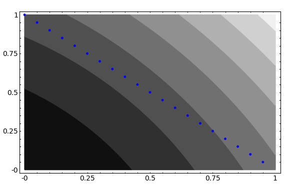 コンター図に沿って描画した\( x + y = 1 \)の点線(青)が最も 小さな値を取るのは、(0.25, 0.75)付近であることが見て取れます。
