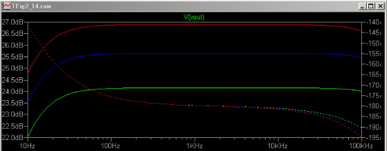 ゲインGは、26.8dbで、倍率では、21.8倍と計算されました。 $$ G = -8.86 - (-35.63) $$