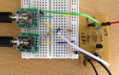 パソコンのイヤフォンとラインインと接続するために、以下の回路をブレッドボードに用意しました。 秋月で販売されている3.5mmジャックをブレッドボードに接続するアダプターが重宝します。