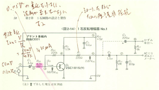 実験本では、エミッタを直接グランドに接続するタイプの例がないので、トランジスタ本の図2-13を実験してみました。