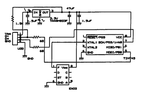 最終のブレッドボードの回路は、USBとTiny45(書込用)の2個を連結しました。