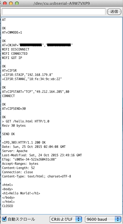私の公開しているSageサーバのWebに接続します。 SageサーバのIPアドレスは、49.212.164.205です。 AT+CIPSTART="TCP","49.212.164.205",80と入力してください。