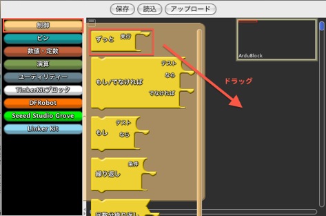 「ずっと 実行」の右端にもっていくと、カチッと音がして「デジタルピンに値を設定」が 「ずっと 実行」の中にセットされます。