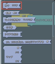 次にユーティリティーボタンをクリックして、「待つ ミリ秒」部品をドラッグし、 先ほどの「デジタルピンに値を設定」の下にドラッグするとまたカチッと音がして、 「ずっと 実行」の中にはセットされます。