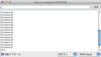 Arduino IDEのツールメニューからシリアルモニタを選択すると、超音波センサからの距離がcm単位で表示されます。