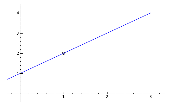 関数 \(f(x)=\frac{(x2−1)}{(x−1)}\)を-1から3の範囲で表示し、座標(1, 2)に丸をプロットします。