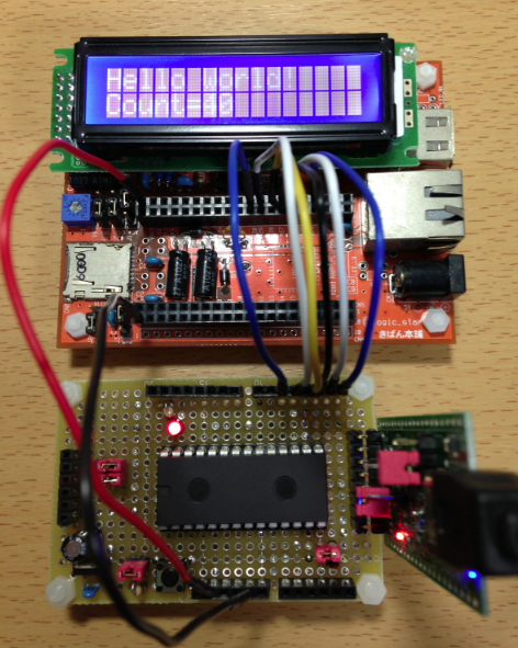 3.3Vで動作するLCDは、オレンジボードに載せたものだけなので、以下の様にオレンジボードと接続して 動作を確認しました。