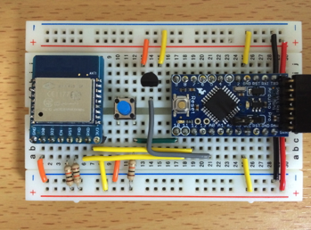 ブレッドボードにESP-WROOM-02とArduino Pro Mini(3.3V)とLM35を以下の様に配置します。 抵抗は10KΩを使いました。
