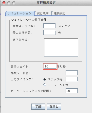 pnutsで記述したスクリプトは、Artisocの外部で別のスレッドとして動いているため、 Artisocの実行環境設定で、実行ウェイトとして、1ミリ以上の値をセットしてください。