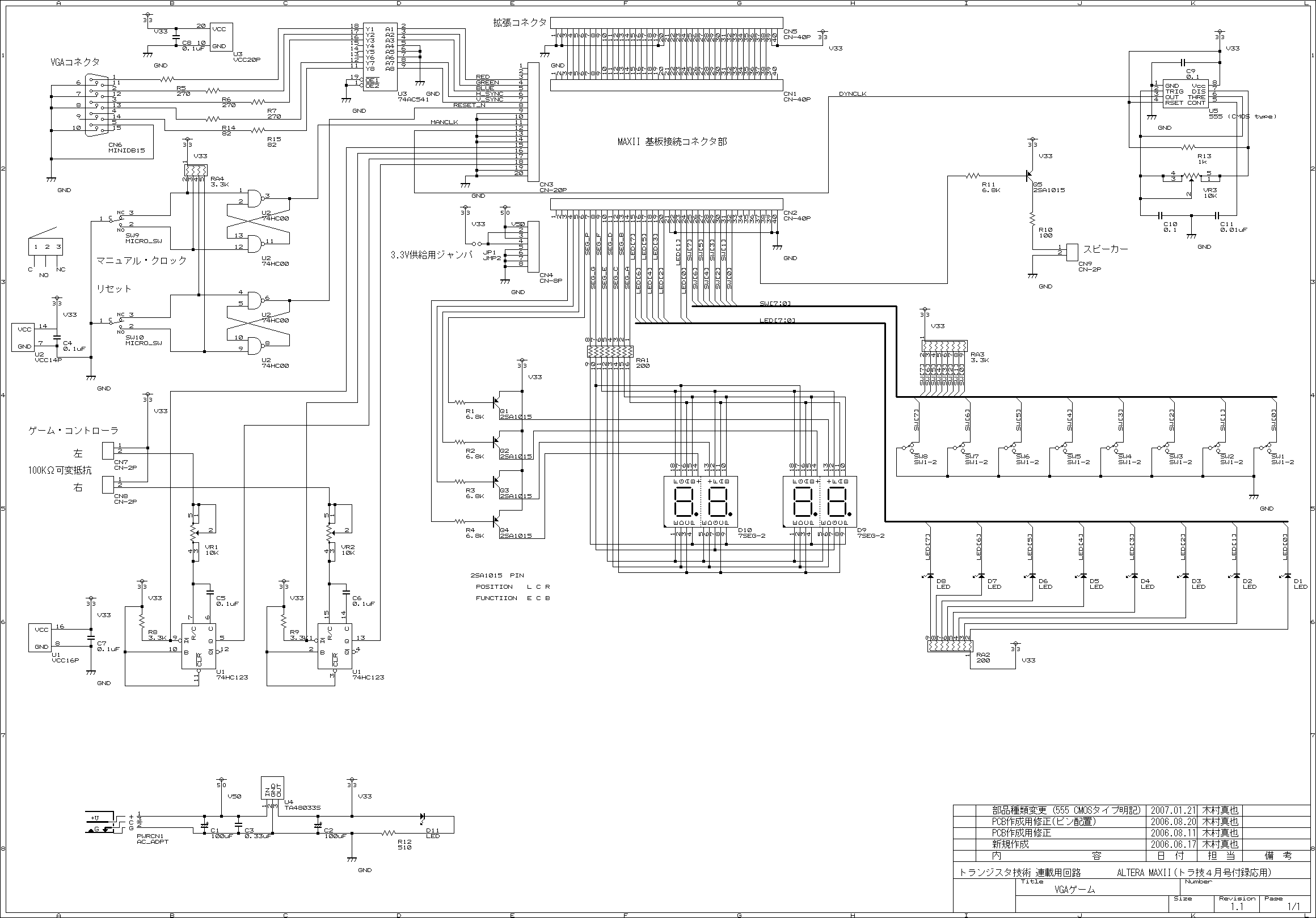 HDL-CQ1では、SELECTOR信号で7セグメントLEDを切り替えているため、 特集の第4章の例題は1個の7セグメントLEDを使うようにしました。