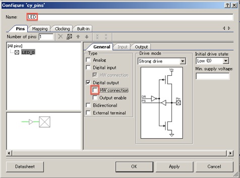 TopDesignでPorts and PinsからDigital Output Pinをドラッグし、ダブルクリックでConfigureを開き、 以下の様に名前をLEDとし、HW connectionのチェックを外します。