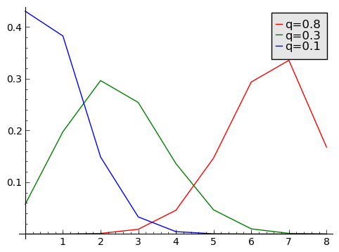 g = Graphics() g += list_plot([_p(0.8, y, 8) for y in (0..8)], plotjoined=True, rgbcolor="red", legend_label ="q=0.8") g += list_plot([_p(0.3, y, 8) for y in (0..8)], plotjoined=True, rgbcolor="green", legend_label ="q=0.3") g += list_plot([_p(0.1, y, 8) for y in (0..8)], plotjoined=True, rgbcolor="blue", legend_label ="q=0.1") g.show(figsize=5)
