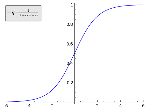 plot(_logistic(x), [x, -6, 6], figsize=5, legend_label='$q=\\frac{1}{1+exp(-z)}$')