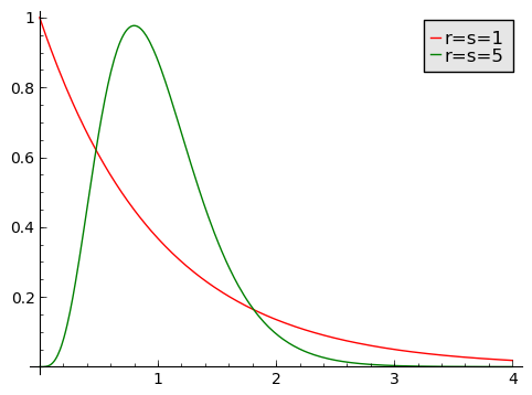 g = Graphics() g += plot(lambda x: _gamma(x, 1, 1), [x, 0, 4], rgbcolor="red", legend_label ="r=s=1") g += plot(lambda x: _gamma(x, 5, 5), [x, 0, 4], rgbcolor="green", legend_label ="r=s=5") #g += plot(lambda x: _gamma(x, 0.5, 0.5), [x, 0, 4], rgbcolor="blue", legend_label ="r=s=0.1") g.show(figsize=5)