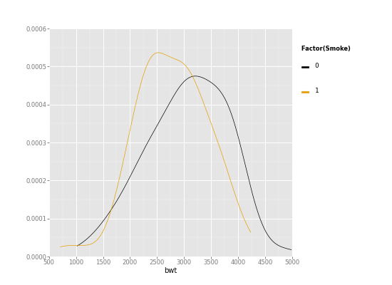 ggplot(birthwt, aes(x="bwt", colour="factor(smoke)")) + geom_density()