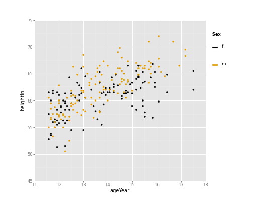 ggplot(heightweight, aes(x="ageYear", y="heightIn")) + geom_point() + theme_bw()