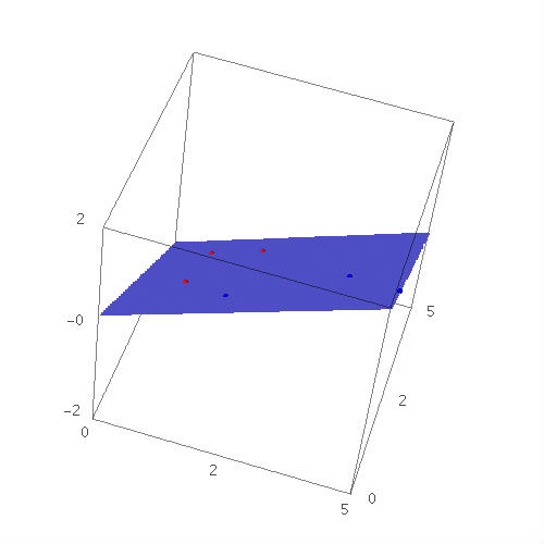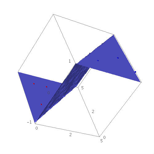 求まった判別式がどのような形なのかplot3dを使って表示してみます。 データ(赤、青)の判別式の値も合わせて表示してみます。