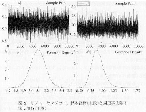 図2は、n=100個の乱数をN(5, 1)から発生させて、事前分布\(\mu \sim N(0, 1000), \sigma \sim IG(0.001/2, 0.001/2)\)とおいてギブス・サンプリングを行った結果です。