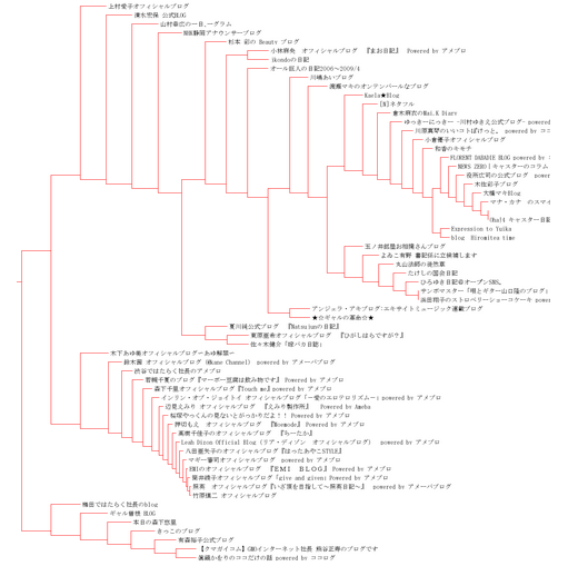アメブロの芸能人のブログが固まっていたり、ちょっとお固そうなブログが集まっていたりとそれらしい分類が されているのが見て取れます。