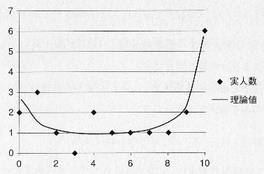 学生の持つ問題解決能力をq(皆同じ値と仮定)とすると、i番目の学生が10点満点中k点を取る確率\(p_i\)は以下のようになります。 $$ p_i = {}_{10} C_k q^k (1 - q)^{10 - k} $$