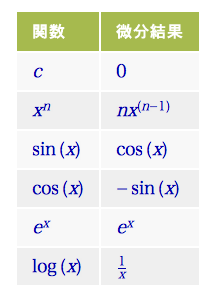 html.table([("関数", "微分結果")] + [(st, diff(st, x)) for st in sts], header=true)