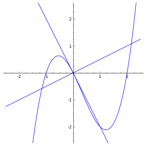 p1 = plot(f, [x, -2.5, 2.5]) p2 = plot(m*(x-0)+f(0), [x, -2.5, 2.5]) p3 = plot(-(x-0)/m+f(0),[x, -2.5, 2.5]) pt = point([0, f(0)]) (p1+p2+p3+pt).show(aspect_ratio=1, ymin=-2.5, ymax=2.5 )