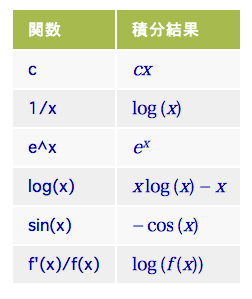 html.table([("関数", "積分結果")] + [(repStr(st), integrate(st, x)) for st in sts], header=true)
