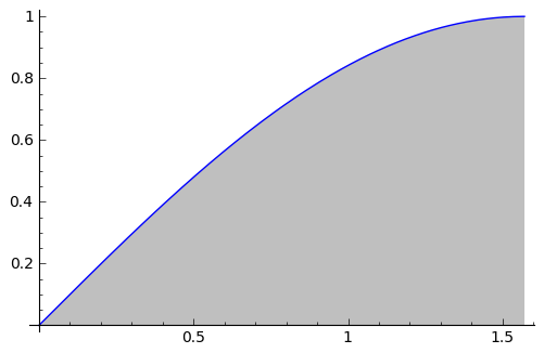 それでは、Sageを使って、\(sin(x)\)を0から\(\pi/2\)の範囲で積分してみましょう。